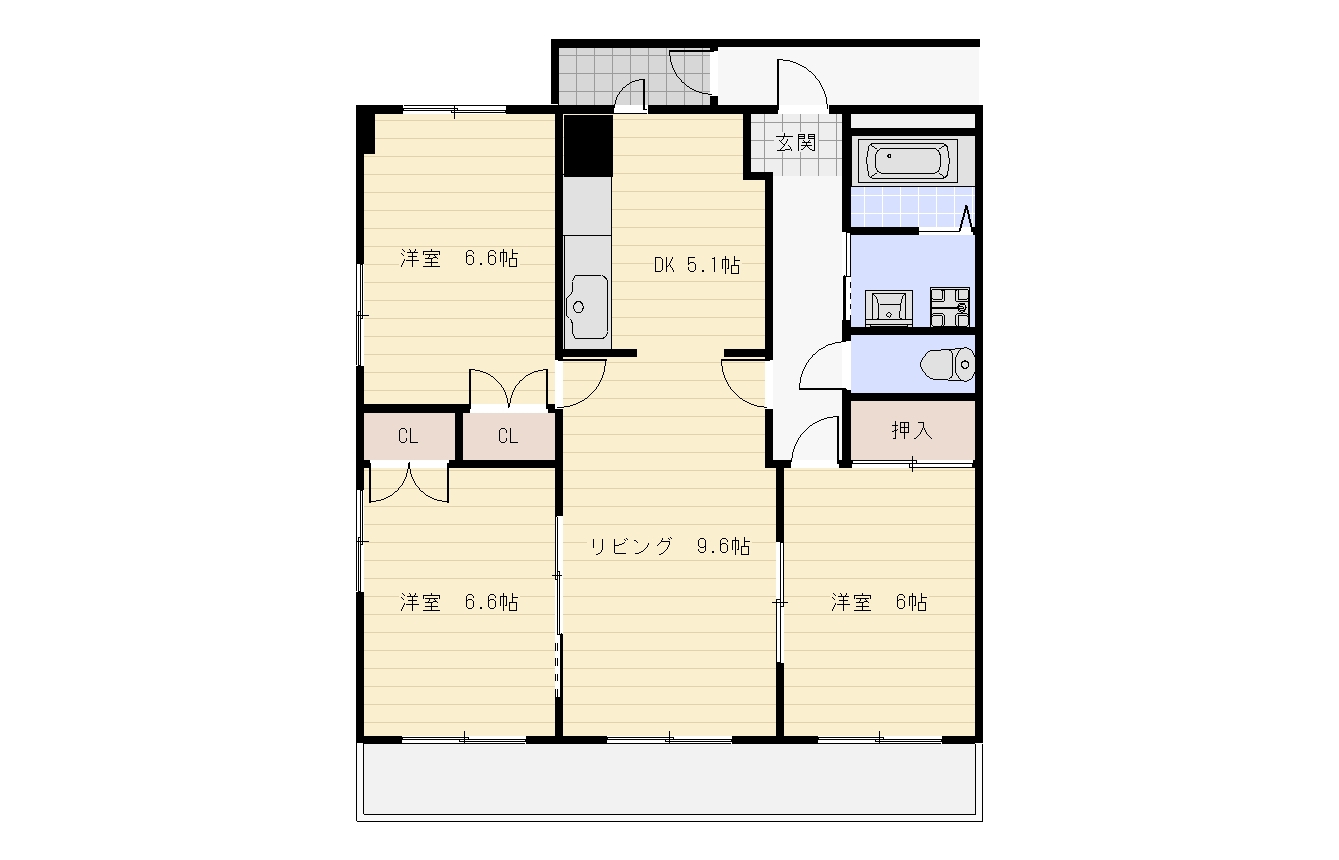 | 間取内容 | 洋室6帖 洋室6.6帖 洋室6.6帖 LDK14.7帖 間取り、号室により反転有り。 条件(設備など)が現況と相違する場合は、現況を優先します。 |